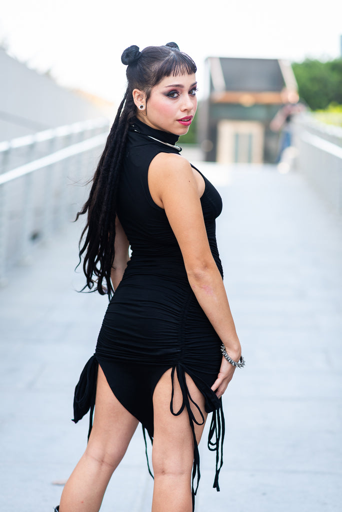 Designed with adjustable side drawstrings, it lets you play with the length while keeping its signature curved hemline and pointed side details. The soft, stretchy fabric hugs the body while allowing total freedom to dance, explore, and embrace your moments.