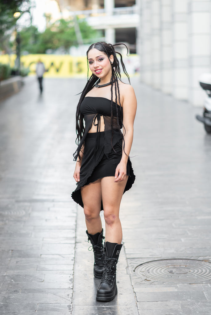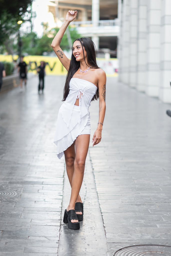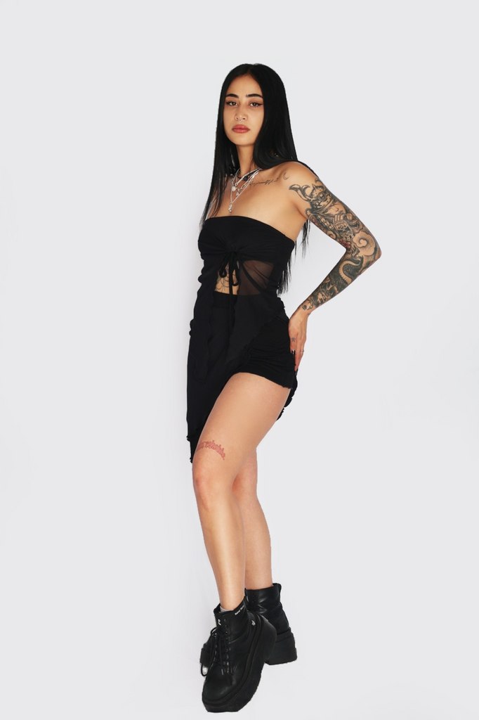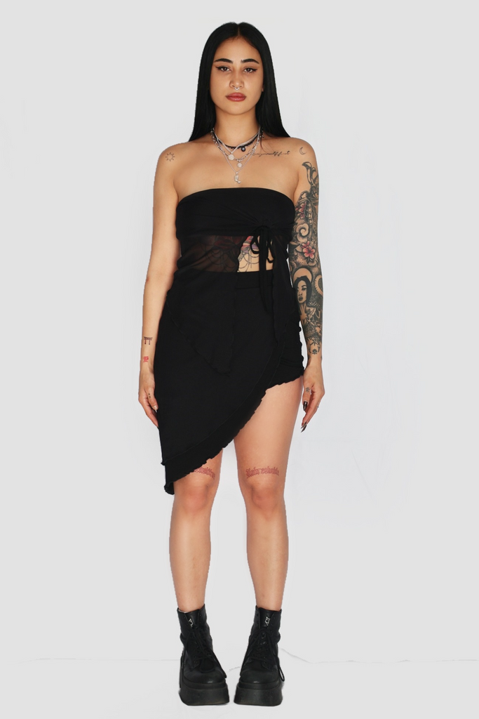 A soft mesh skirt with an asymmetrical cut and layered ruffle edges. Adding movement and an effortless flow. The sheer fabric makes it easy to style with anithing and especially with the strapless mesh tie top matching set . A perfect balance of edgy and delicate, great for festivals or casual statement looks.